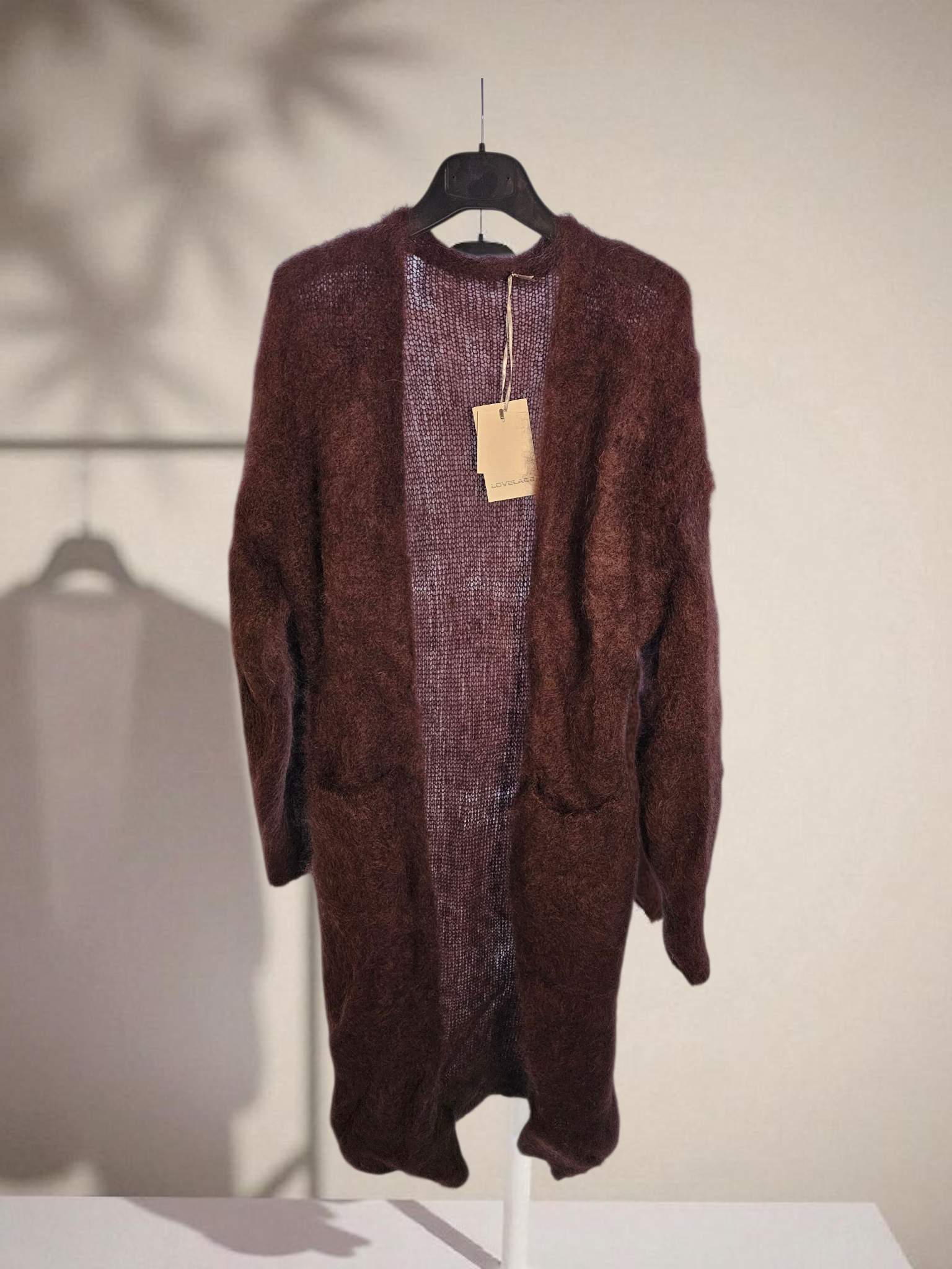 Ylellinen, pehmeä ja muhkea neuletakki. Valmistettu Italiassa laadukkaasta Kid mohair lankasta. Sisältää 80% kid mohairia, 18% nylonia ja 2% elastaania. Vastaa kokoa S-L.